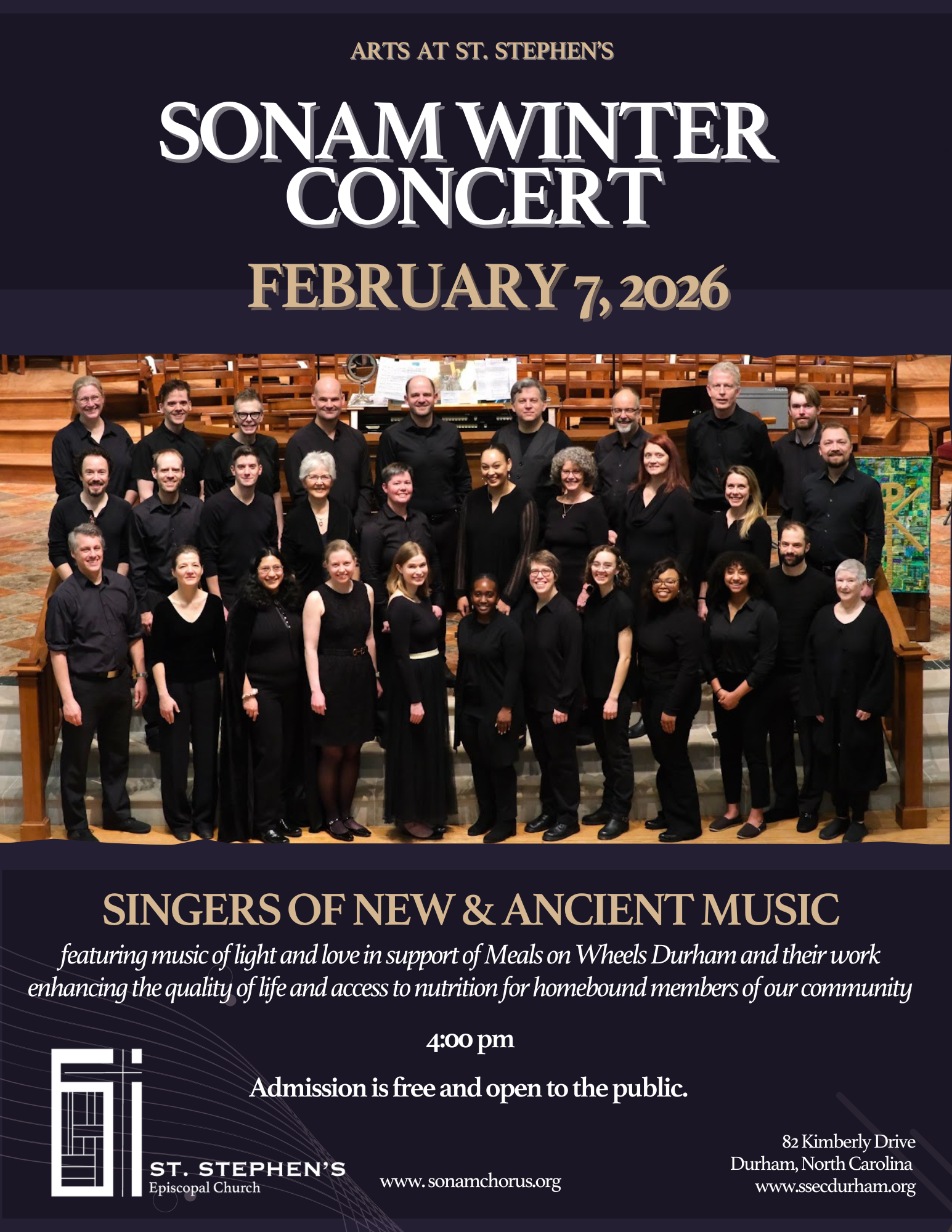 Singers of New & Ancient Music will be having their winter concert at St. Stephen's on Saturday, February 7th at 4:00 p.m. This event will also benefit Meals on Wheels. The theme is Music of Light and Love in support of the hungry and isolated in our community. Admission is free, but all donations will go to Meals on Wheels Durham and their work enhancing the quality of life and access to nutrition for homebound members of our community.